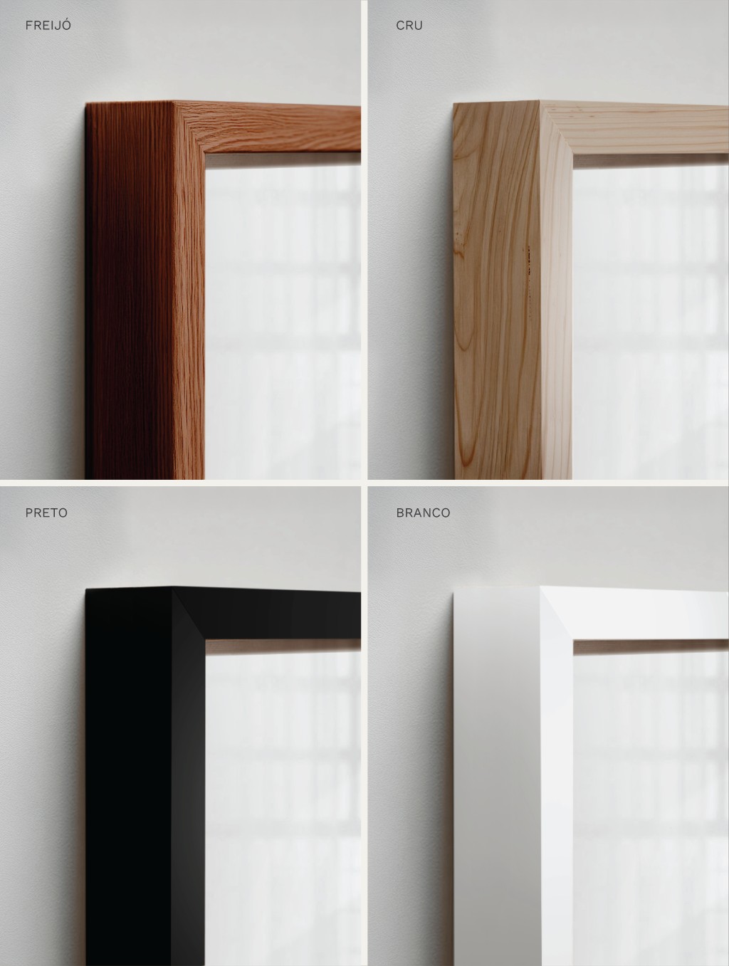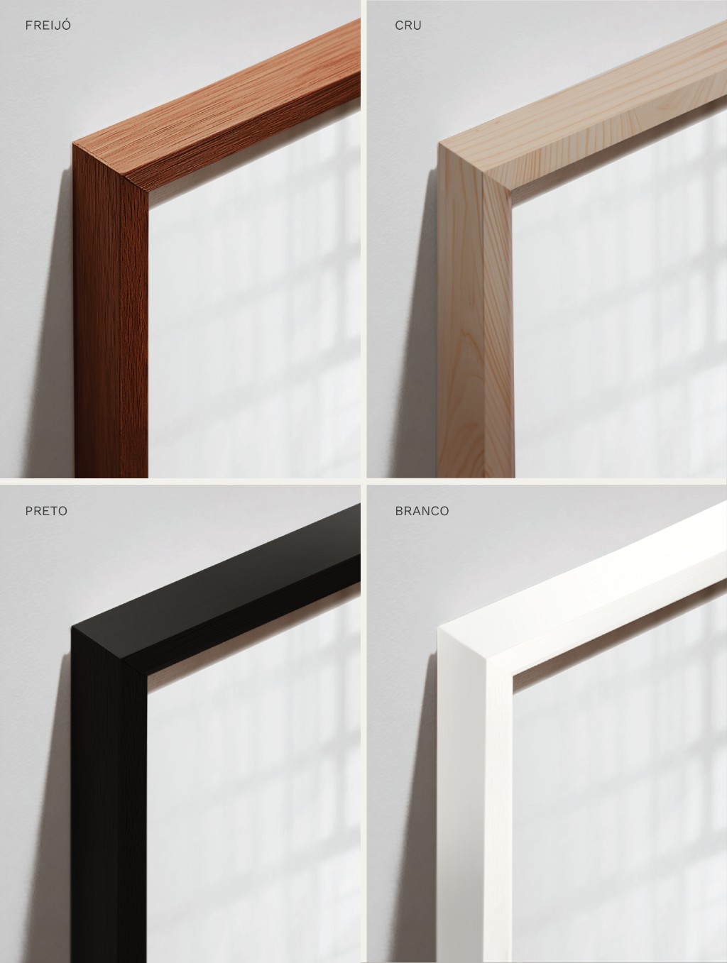 MOLDURA FILETE – Perfeita para decorações mais minimalistas e clean. Tem 0,7cm de espessura (olhando de frente) e 2cm de profunidade (olhando de lado). Nessa opção a arte é impressa em vinil fosco com tecnologia HP Látex, tinta ecológica e aplicada em MDF 3mm especial para quadros. Deixando assim a obra resistente, com um acabamento perfeito e fácil de limpar.